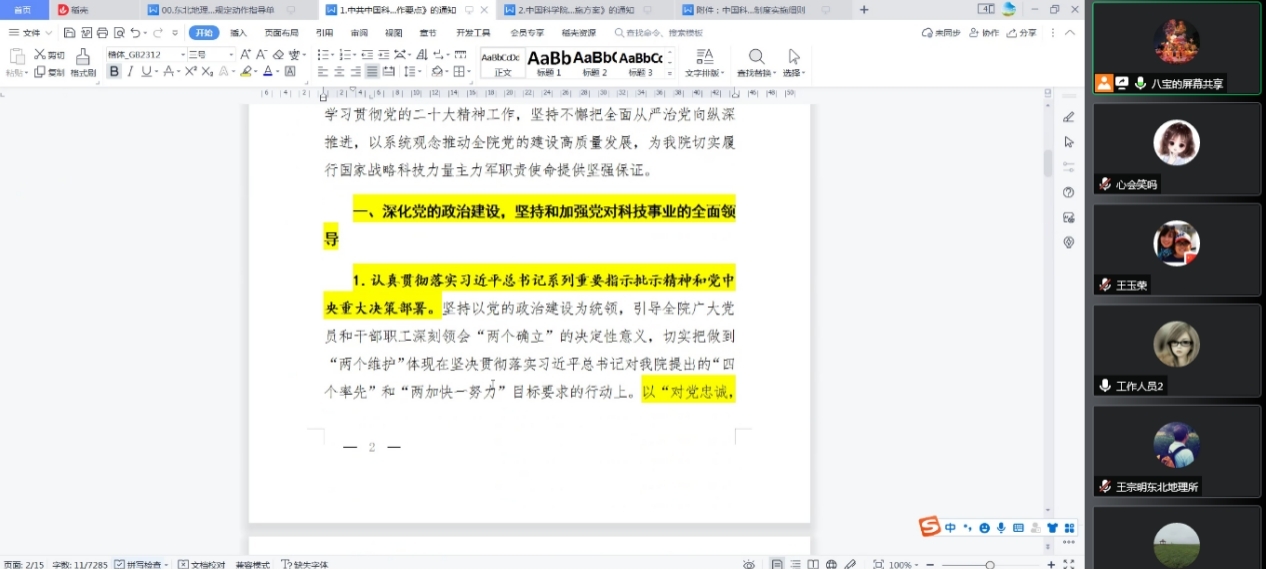 4月22日,东北地理所人事党支部召开线上支部大会,会议由党支部书记郭琳主持,党委委员、副所长王宗明和支部全体党员参会。