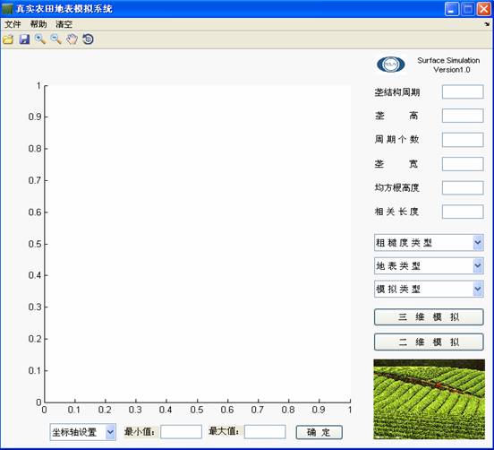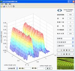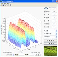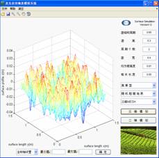 农田表面在大尺度表现为沟垄分布的周期性变异特征,为定向粗糙度;在小尺度上表现为不同颗粒团聚体的非定向空间分布,为随机粗糙度。翻耕过的农田表面泛指小尺度的随机粗糙度和周期性的定向粗糙度两者的叠加的特征,未翻耕过的农田表面只表现为小尺度的随机粗糙度特征。通过分析自然状态下翻耕前小尺度的农田随机粗糙度特征和翻耕后大尺度的周期性特征,利用基尔霍夫理论分析了高斯分布及指数分布下随机粗糙地表的高度分布状况,模拟了自然农田粗糙表面及叠加了随机粗糙特征的周期性农田沟垄结构,实现了在不同的粗糙度参数和周期性参数下对不同类型的真实农田地表的模拟。用户可根据设定的表面粗糙度参数及沟垄周期参数模拟自然状况下的农田表面,包括翻耕前的小尺度随机粗糙地表及翻耕后的周期性沟垄结构的农田表面,并且可以根据输入参数获取各种农田地表类型的二维剖面,随机粗糙地表的高度可选择高斯和指数两种分布类型。