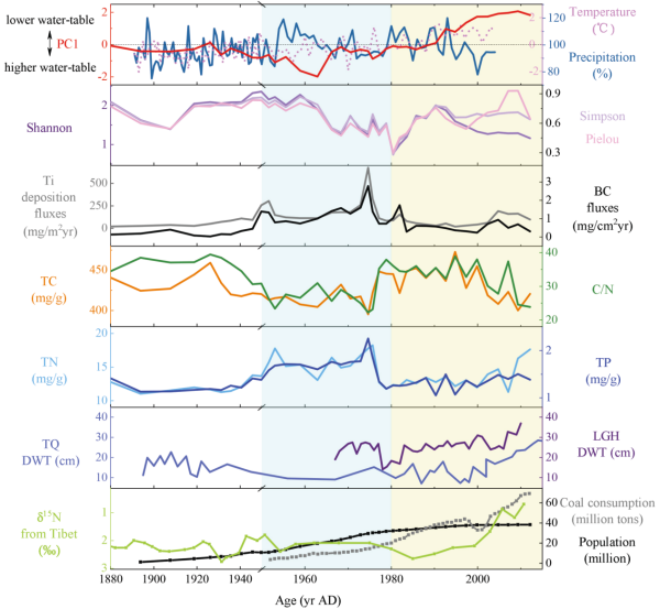 东北地理所湿地演化与生态功能学科组以大兴安岭北部宏图(HT)泥炭地为研究对象,阐明过去150年来泥炭地硅藻组合特征和多样性;基于硅藻重建历史时期泥炭地水位变化,并结合地球化学代用指标,探讨人类活动和气候变化对泥炭地水文环境演变过程的影响。研究结果表明:1950年以前宏图泥炭地水文环境演变主要受气候影响,由于当地居民以狩猎和采集活动为主,泥炭地保持着原始状态。1949年新中国成立后,由于人口快速增长、采矿业和工业等因素导致火灾频发,硅藻多样性遭到破坏。1980年特别是2000年以后,耐高氮型硅藻种类(Achnanthidium minutissimum和Craticula molestiformis)的突然增加表明人类活动引起的氮沉降效应增强。20世纪80年代以来,煤炭燃烧、工业化、城市化和人口指数增长对大兴安岭地区泥炭地水文环境演化具有重要影响。工业生产和煤炭消耗造成的人为源排放增加了大气氮沉降,宏图泥炭地的水文环境不稳定(干旱和氮沉降增加)是由全球变暖和人为大气排放共同造成的。人类活动对泥炭地的强烈影响在泥炭沉积物中留下了人类世的显著地层学信号。