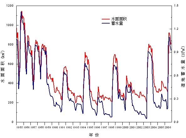 图1 1985-2006年各月湿地水面面积和蓄水量的变化