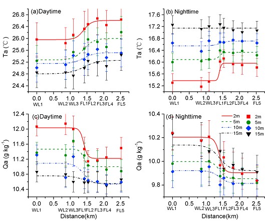 湿地面积在大幅度下降的同时,其景观呈现着逐步破碎化的趋势,湿地斑块与农田斑块之间的边缘数量急剧增加,带来区域小气候的巨大变化,为此有必要深入探讨湿地与农田边缘带近地层冷湿气象要素的时空变化规律。以往的研究缺少小气候边缘效应模式的定量化解释,我所生态遥感学科组与区域大气环境学科组合作,以中国东北地区三江自然保护区作为研究区,基于实地测量与Logistic模型模拟,确定了描述边缘带湿地冷湿效应的定量指标,即边缘效应强度(MEE)与边缘效应范围(REE);并在此基础上深入分析了湿地-农田边缘带冷湿气象要素的时空变化规律。