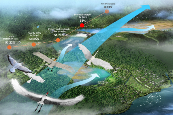 研究进一步表明,将小/孤湿地纳入保护体系后,迁徙鸟类停歇地间距可由平均20.9公里缩短至3.2公里,显著增强生态连通性。这不仅有助于提升生物多样性保护和生态系统韧性,也与《昆明—蒙特利尔全球生物多样性框架》提出的“30×30”目标高度契合,即到2030年有效保护30%的陆地和内陆水域。作为首个针对中国小/孤湿地的系统盘点,该研究提出了一套可推广的数据驱动框架,为全球快速湿地评估提供了新思路。通过认清这些“小而关键”湿地的保护价值,并通过制定优先、中等和一般的分类保护建议,填补全国尺度湿地保护空缺,提升中国湿地生态系统系统和全面保护继续走在世界前列。