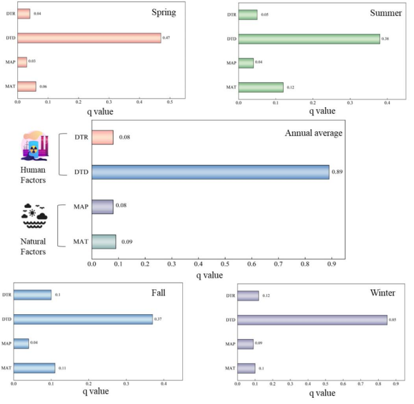 通过GeoDetector空间探测模型分析,研究发现排水沟密度和距离是泥炭地沉降的最强驱动因素(q = 0.89),表明人为水文改造直接导致了地表下陷和泥炭压实。道路建设及放牧活动在局部区域亦加剧了沉降过程。气候因子方面,降水减少和气温升高在干旱年份强化了季节性下沉,但其空间解释力较弱,主要表现为冬季冻融过程对地表稳定性的调制作用。研究指出,泥炭地的沉降是长期水文扰动和季节性气候反馈共同作用的结果。