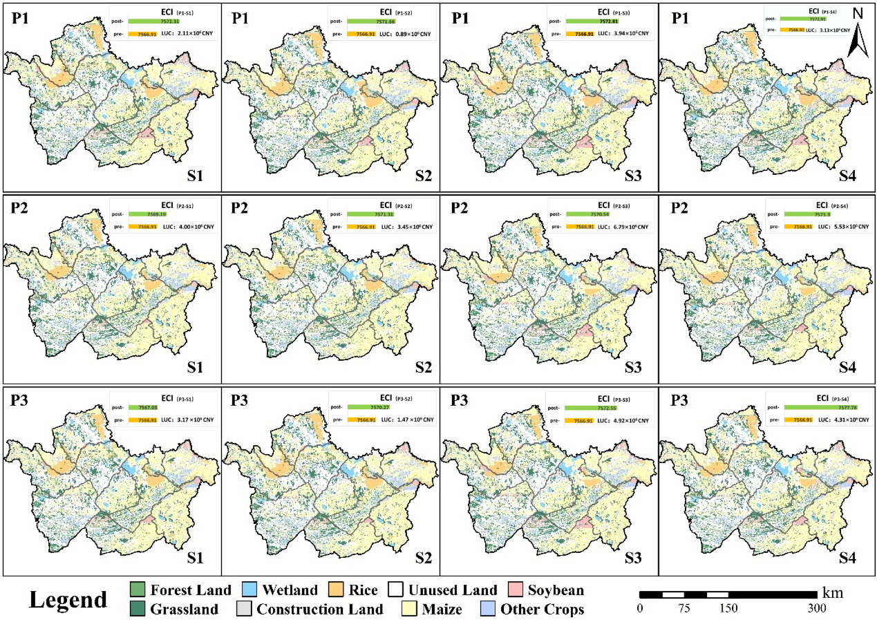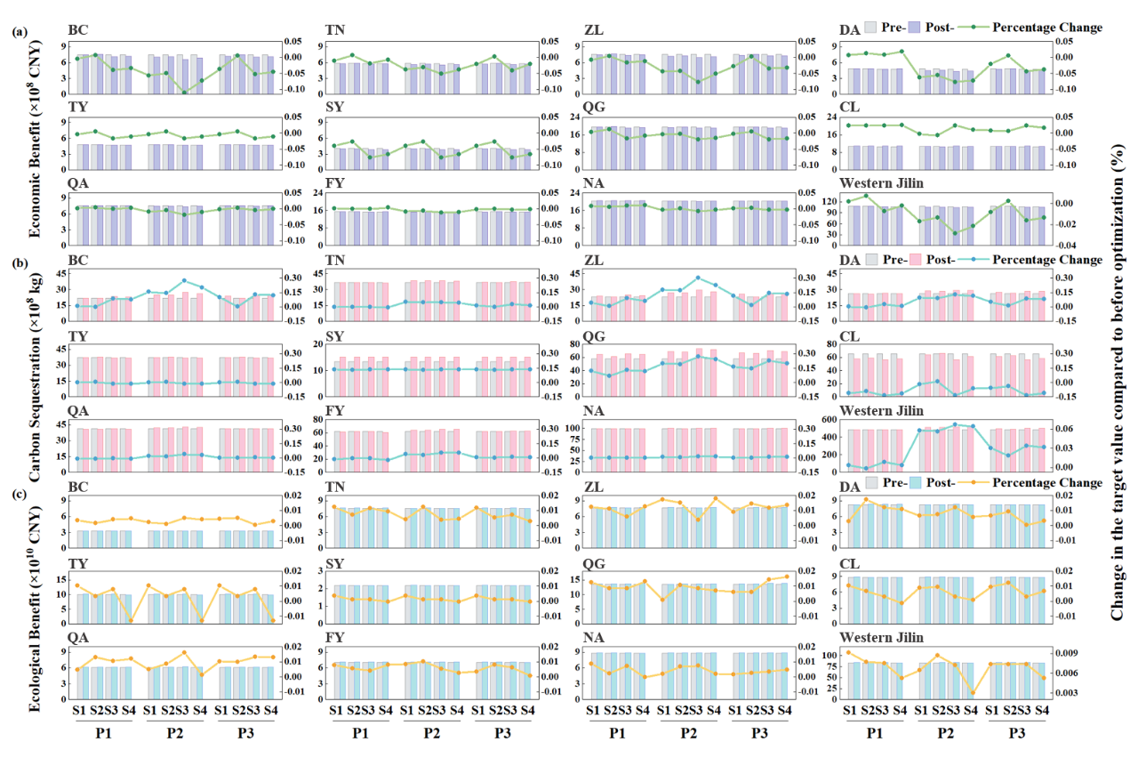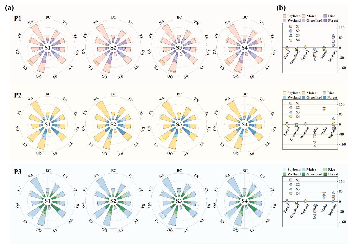 针对上述挑战,中国科学院东北地理与农业生态研究所联合吉林省水文与水资源局,以吉林西部为典型研究区,突破了传统水土资源配置中总量优化与空间格局分离的研究范式,构建了一个水–碳–粮–生态多要素协同的水土资源优化配置与空间布局一体化研究框架,实现了从宏观资源配置到微观空间落地的系统衔接。在宏观尺度上,模型以农业灌溉用水约束为核心,综合考虑经济收益、粮食生产、固碳效益与生态效益等多重目标,设置经济优先(P1)、碳汇优先(P2)和综合协调(P3)三类决策偏好,并在平水年与枯水年条件下,分别引入常规灌溉与节水灌溉情景(S1-S4),刻画不同水资源条件与管理策略下水土资源配置方案的响应差异。在微观尺度上,将宏观优化的土地利用结果作为空间约束条件,引入生态连通性(ECI)与土地利用转化成本(LUC)指标,对土地利用类型在栅格尺度上的空间布局进行优化,实现水土资源配置与空间格局调控的协同统一。研究结果表明,各类情景下农业灌溉用水量均显著降低,节水幅度约为3%–18%,水资源利用效率明显提升。不同决策偏好对应的资源配置路径和综合效益存在显著差异:经济优先决策下(P1),策略倾向于保留高价值但耗水的水稻种植,对经济损失的控制较好;固碳优先情景(P2)下,通过显著增加玉米等高碳汇作物种植比例,实现了最优的节水效果和碳汇增益,区域碳固存量增加约2.97×10⁹kg;综合协调情景(P3)在多目标之间实现了相对均衡,灌溉用水量减少4.58%–16.86%,碳固存量提升约2.86%。相关结果可为吉林西部不同县市因地制宜制定差异化资源管理策略提供依据。在满足宏观配置约束的前提下,通过对农业用地与生态用地的合理调整,可在较低土地转化成本条件下有效提升区域生态连通性,生态连通性指数整体提高约0.3‰–1.4‰。该研究从水–碳–粮–生态多要素耦合视角出发,为干旱与半干旱农业区水土资源精细化管理提供了系统化决策支持框架,对区域农业结构调整、水资源调控及生态修复具有重要参考价值。