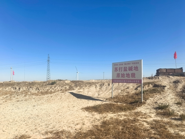 示范区里,一条窄窄的土路,隔开两片天地——一边是保留下来的苏打盐碱地原始面貌,碱斑累累,寸草不生;另一边则谷穗低垂,满载希望。