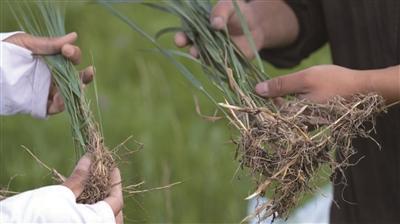 “这是羊草地下横走的根茎,根茎最顶端的芽非常坚硬,横着向前生长,每生长一段根茎就会有一个芽点,芽点上就会长出新的羊草苗,然后继续往前走,再长出来,可以长到几米长,这就是羊草的无性繁殖。”中国科学院东北地理与农业生态研究所研究员马红媛手中拿着一束羊草样本向笔者介绍,“羊草的生命力非常顽强,地下根茎非常茂盛,可以起到快速扩繁防风固沙作用。”