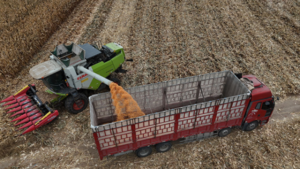 联合收割机收获玉米籽粒装车运送粮仓。关永喜摄