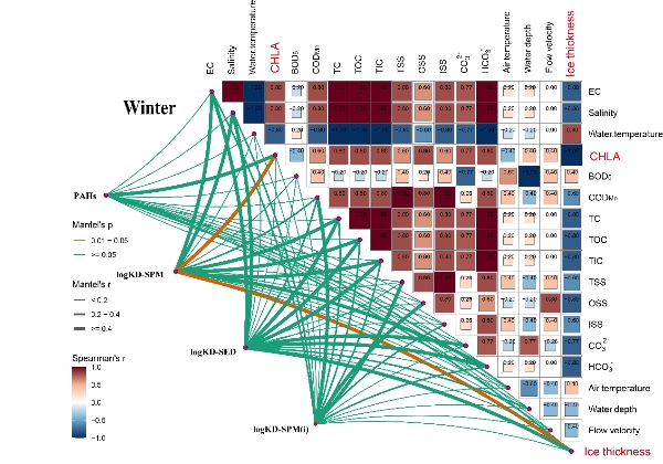 在此基础上,本研究运用Ⅳ逸度模型和Spearman相关性分析来对湖泊中PAHs的环境行为过程进行刻画,并明确其主要驱动机制。逸度模型分析表明,低环PAHs易从沉积物向上迁移至水层,而高环PAHs则表现出相反的趋势。Spearman相关性分析表明,冰封期PAHs的分布受其自身理化性质、研究区自然条件以及人为活动等因素协同影响。本研究解释了寒区湖泊PAHs的特异性环境行为特征及规律,为寒区湖泊污染物综合管控提供理论基础。