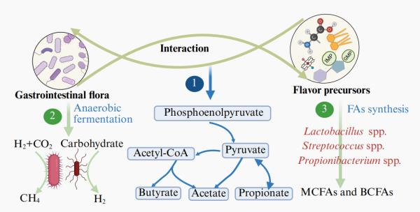 图2胃肠道微生物群及其代谢活动与羔羊风味前体物质形成与积累过程之间的关系