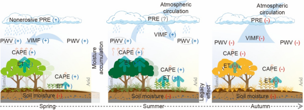 图1 中国温带植被物候提前对降雨影响的物理机制示意图