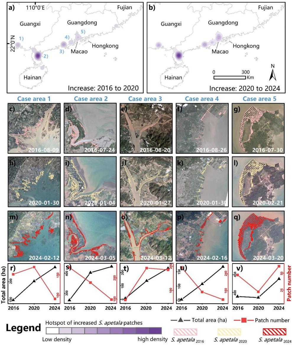 研究结果表明,由Sentinel-1 VH极化后向散射系数与Sentinel-2 B11波段构建的决策规则能够有效识别无瓣海桑。经后处理优化后,获得了2024年全国无瓣海桑分布数据,总体验证精度达97.0%。结合历史分布数据分析发现,在2016—2024年间基本杜绝人为栽植的背景下,无瓣海桑空间分布格局总体稳定,但面积持续增长。通过对扩张热点区域“面积—斑块数量”关系的动态分析,揭示其在环境阻力增强过程中逐步由快速扩张阶段过渡至中后期相对稳定阶段。