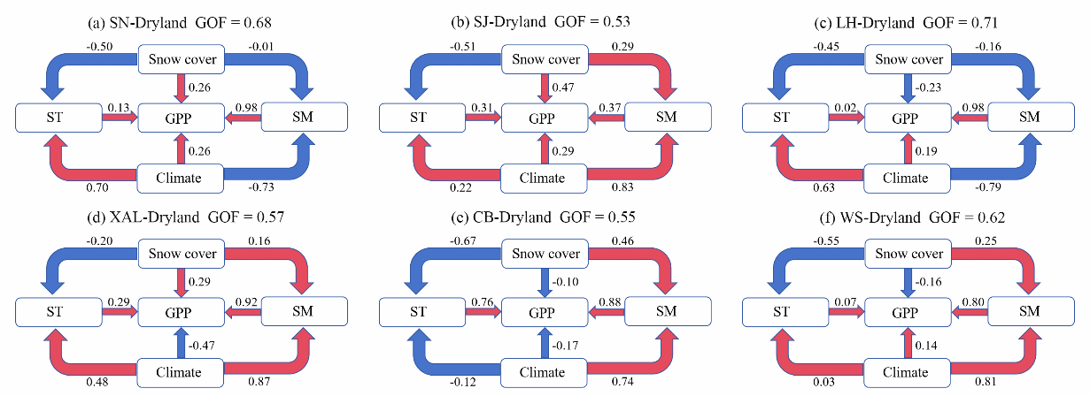 PLS-SEM方法量化了积雪通过土壤水热条件影响耕地GPP的作用路径,具体表现为热量效应和水分效应。在热量效应上,积雪通过降低土壤温度抑制GPP。在水分效应上,积雪在干旱水分区(如西部风沙区、辽河平原)促进GPP,而在高寒热限区(如长白山、兴安岭等)积雪抑制GPP。