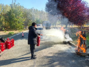 在灭火器材实操区,参训人员在物业义务消防队员的指导下,轮流操作干粉灭火器和二氧化碳灭火器,亲身参与扑灭模拟火源。大家认真听讲、积极动手,在实践中进一步掌握了灭火器材的正确使用方法,提升了扑救初起火灾的信心与能力。