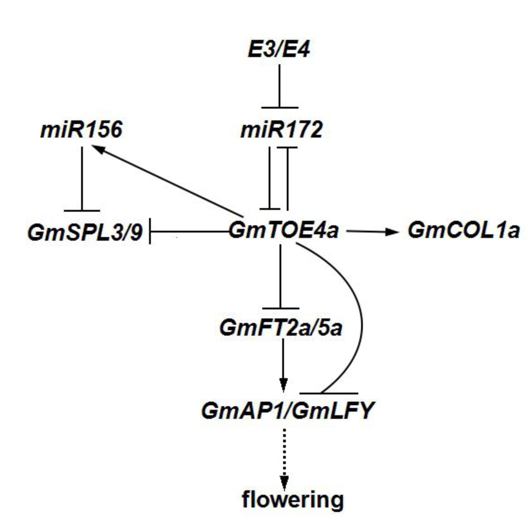 中科院大豆分子设计育种重点实验室成功克隆了 microRNA172 的靶基因 GmTOE4a,功能互补实验表明 GmTOE4a 延迟大豆开花;研究发现GmTOE4a延迟从营养生长到生殖生长期的转换是通过抑制开花相关基因 GmFT2a、GmFT5a、GmAP1、GmLFY 的表达,而促进 GmFT4 和 miR156 的表达实现的。进一步研究发现GmTOE4a 参与的光周期调控大豆开花途径是在生育期基因 E3 和 E4 的作用下,依赖于 GmCOL1a 的表达,并且在转录水平不受 GI 同源基因 E2 的调控。