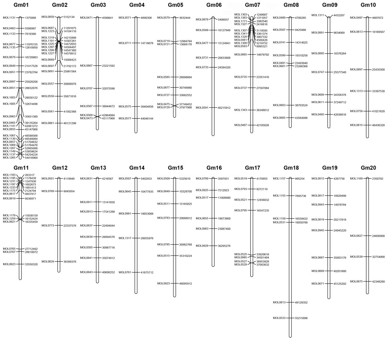 研究组成员通过对大豆“菏豆12”品种的全基因组重测序,获得了与“Willams82”品种存在差异的49,276个INDEL分子标记和242,059个SNP分子标记。通过对其中243个INDEL分子标记的实验验证,建立了165个INDEL分子标记大豆分子标记物理图谱。利用该图谱和进一步开发的INDEL分子标记成功地将大豆叶皱突变体定位到了360Kbp的关联区间。本研究为大豆重要农艺性状基因克隆和分子辅助育种等研究提供了重要的研究手段。