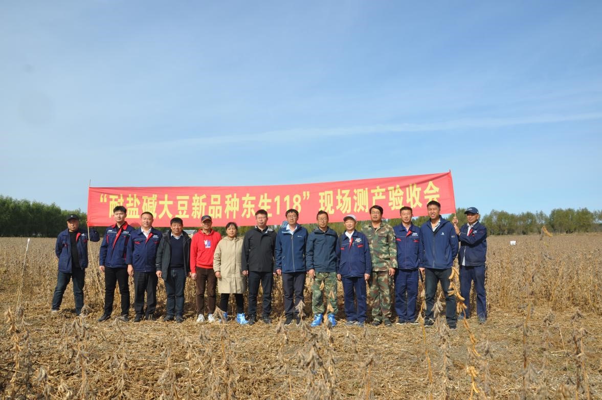 中国科学院东北地理所与吉林省浩淞农业在吉林省长春市农安县小城子乡盐碱地块进行“东生118”生产示范,面积530亩,示范田块pH值为8.2~9.5.含盐量为0.35~0.55%,采用垄上双窄行播种方式。测产专家现场实地踏查后选取1.11亩示范地块,收获籽粒总重量243.9公斤,含水量11%,按13%标准含水量折算,耐盐碱大豆“东生118”亩产为224.78公斤。专家对于“东生118”在东北盐碱地的优良表现给予了肯定,认为该品种的成功培育为利用盐碱地提升大豆产能提供了优异的品种。