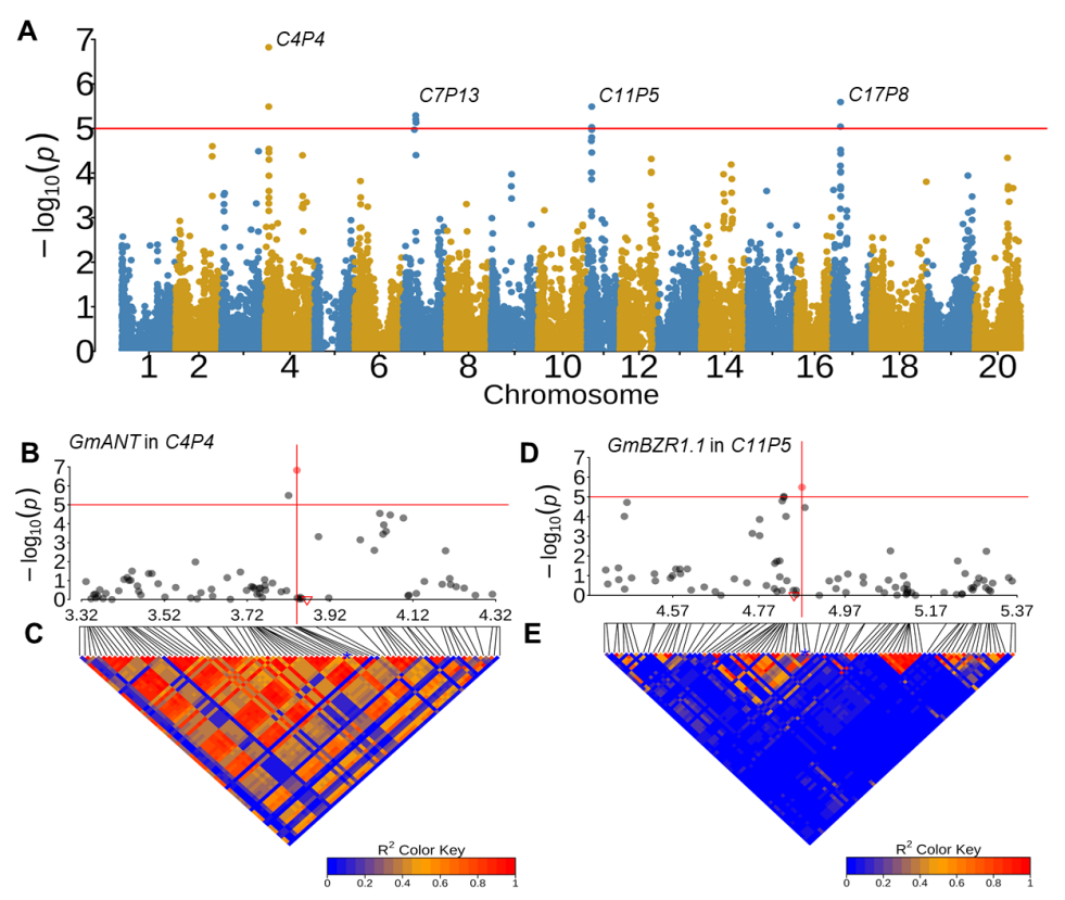 近日,东北地理所大豆遗传与分子改良学科组张恒友研究员团队利用收集的世界大豆全基因组基因分型数据和粒重、成熟期数据,通过对多环境获得的表型数据的全基因组关联分析研究,鉴定了一批参与大豆粒重和生育期的数量性状位点(QTL);同时,利用大豆与拟南芥部分生长发育的分子机制相对保守的特性,结合拟南芥已报道粒重和成熟期相关基因,鉴定了一批大豆粒重和成熟期长短控制相关候选基因,为这两个性状的分子生物学研究和大豆生物育种提供了重要基因资源(图1)。团队正在通过建立的大豆高效遗传转化平台研究这些基因在调控大豆粒重、蛋白质和油脂以及成熟期方面的分子机制;同时评价它们在生物育种方面的应用潜力。