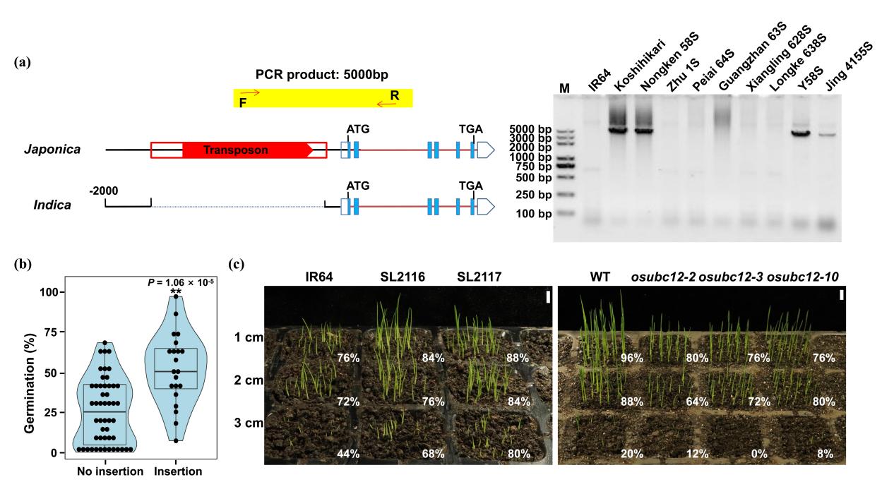 研究团队首先以染色体片段代换系(IR64背景/ Koshihikari渐渗)为试材,经萌发测试、群体构建及定位发现,与籼稻IR64相比,粳稻Koshihihikari背景中E2泛素耦合酶基因OsUBC12启动子中插入了一个转座子基因(约6kb)。进一步分析表明,OsUBC12启动子中转座子的插入能够显著提高OsUBC12的转录水平,进而促进水稻的低温萌发(图1)。OsUBC12的自然变异分析表明,该转座子的插入主要发生在粳稻亚种中,并已应用到籼粳杂交育种(图2)。分子和生化分析表明,OsUBC12能够招募OsSnRK1.1,并在体内和体外促进OsSnRK1.1的降解(图3),进而促进水稻的低温萌发。