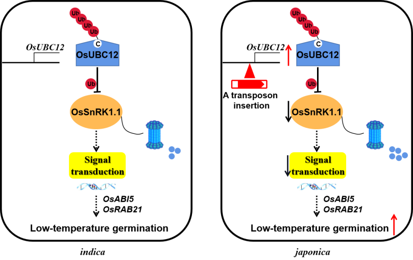 基于以上结果,该研究提出了OsUBC12参与调控水稻低温萌发的工作模型(图4):OsSnRK1.1作为下游的关键调节因子,通过上调ABA信号抑制低温萌发。OsUBC12主要催化K48-多聚泛素化修饰,能够招募OsSnRK1.1并促进OsSnRK1.1的降解。与籼稻相比,粳稻OsUBC12启动子中转座子的插入显著激活OsUBC12的表达。而丰度提高的OsUBC12蛋白进一步促进OsSnRK1.1的降解,从而削弱OsSnRK1.1调节的ABA信号传导,增强粳稻的低温萌发能力。