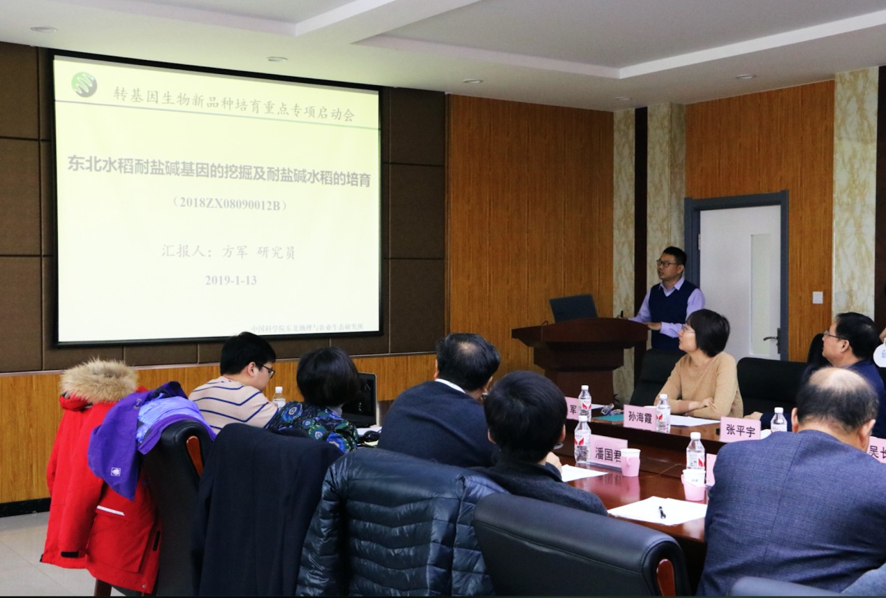 2019年1月13日,国家转基因生物新品种培育重大专项“东北水稻耐盐碱基因的挖掘及耐盐碱水稻的培育”(2018ZX0800912B)和“利用基因编辑创制优质早熟抗病粳稻新品种”(2018ZX0800102B)两个课题的启动会在中科院东北地理所哈尔滨所区顺利召开。国家农业农村部科技发展中心沈平研究员和刘凯副研究员、东北地理与所张平宇副所长出席了会议。会议由东北地理所哈区科研处负责人孙海霞主持。