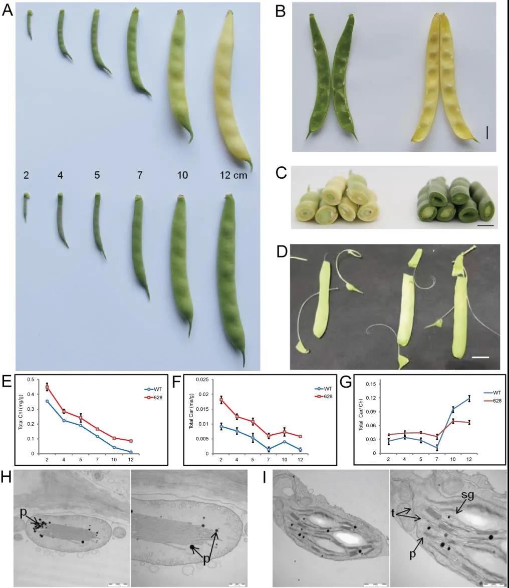 A:豆荚不同发育时期;B、C:豆荚内部及横切表型;D:绿荚突变体多纤维表型;E、 F、G:豆荚叶绿素和类胡萝卜素含量测序;H、I:豆荚叶绿体结构观察