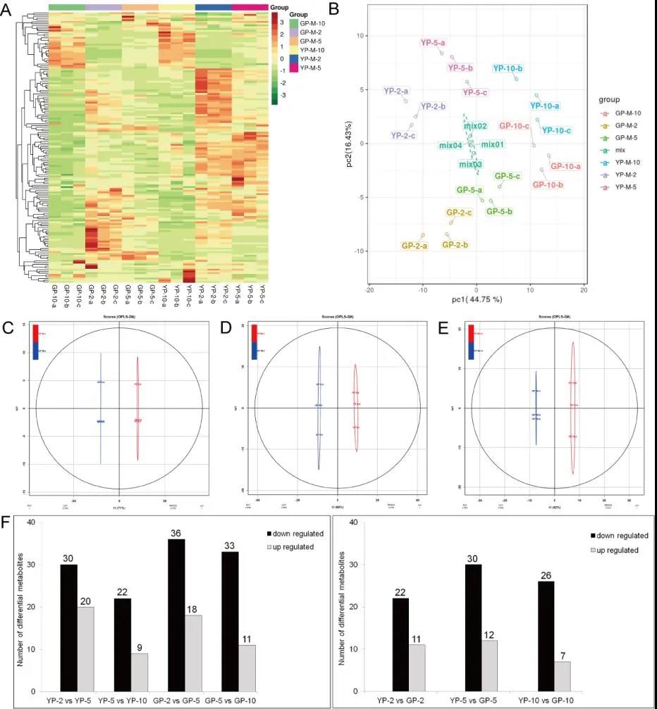 A:差异代谢物聚类分析;B: 差异代谢物的主成分分析(PCA);C、D、E:差异代谢物OPLS-DA分析;F:不同比较组间差异代谢物数量统计