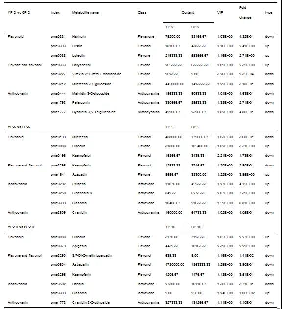 研究表明:随着豆荚发育,很多类黄酮物质发生明显变化,且在野生型和绿色豆荚突变体间出现明显差异(图3A-E)。共检测到154种类黄酮物质,且随着豆荚发育,多数类黄酮物质含量降低(图3F)。在黄金勾中,柚皮苷,牡荆素-2-O-鼠李糖苷,异槲皮甙,槲皮素,山奈酚,紫云英苷和芒柄花苷含量较高。而木犀草素,芹菜素,李属异黄酮,鹰嘴豆素,黄颜木素在绿色豆荚突变体中含量较高。共检测到5中花青素类物质,且均是在野生型中含量高于绿色豆荚突变体(表1)。