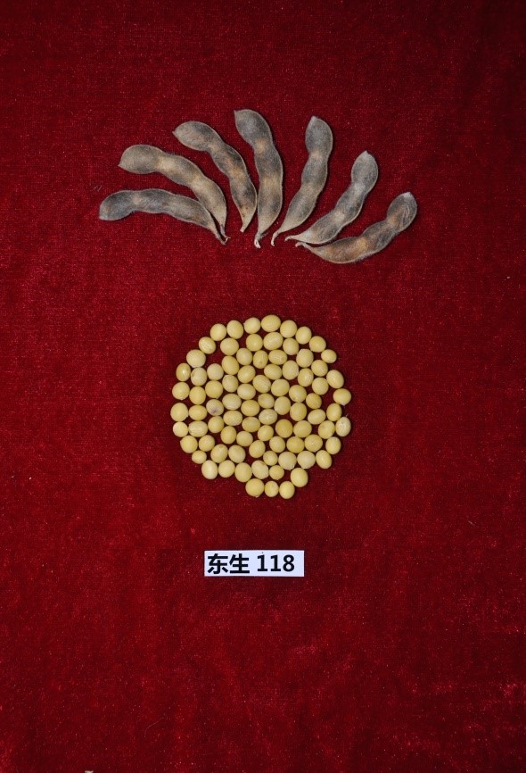“东生118” (审定编号:吉审豆20210028)为高产、高油大豆新品种。该品种以吉育79为父本,黑河43为母本。2019-2020年区域试验平均公顷产量2977.4公斤,比对照吉育86增产7.1%;2020年生产试验平均公顷产量2980.1公斤,比对照吉育86增产4.6%。“东生118”品种亚有限结荚习性,平均株高93.5厘米,主茎型结荚,主茎节数16.9个,以三粒荚为主,荚熟时呈深褐色。圆叶、白花、灰毛,籽粒圆形,种皮黄色,无光,种脐黄色,平均百粒重22.6克。人工接种鉴定,高抗大豆花叶病毒1号株系,抗大豆花叶病毒3号株系。两年平均籽粒粗蛋白质含量38.53%,粗脂肪含量22.59%。