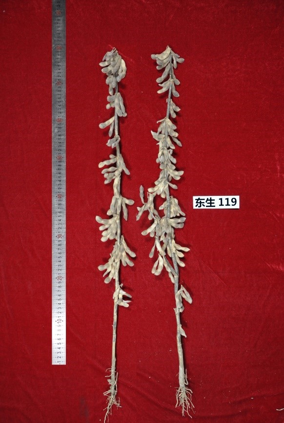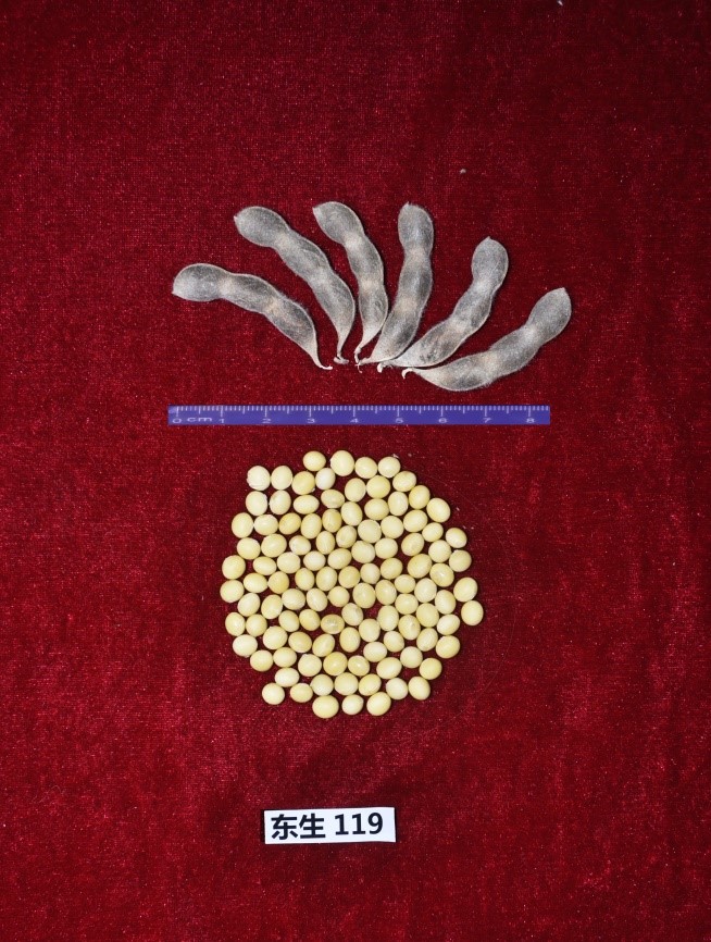 “东生119” (审定编号:吉审豆20210029)为高产大豆新品种。该品种以吉育47为父本,黑农51为母本。2019-2020年区域试验平均公顷产量3009.3公斤,比对照吉育86增产8.1%;2020年生产试验平均公顷产量2953.1公斤,比对照吉育86增产5.4%。亚有限结荚习性,平均株高88.1厘米,主茎型结荚,主茎节数17.7个,以三粒荚为主,荚熟时呈深褐色。圆叶、白花、灰毛,籽粒圆形,种皮黄色,有光泽,种脐黄色,平均百粒重21.6克。人工接种鉴定,高抗大豆花叶病毒1号株系,高抗大豆花叶病毒3号株系。两年平均籽粒粗蛋白质含量38.14%,粗脂肪含量21.24%。