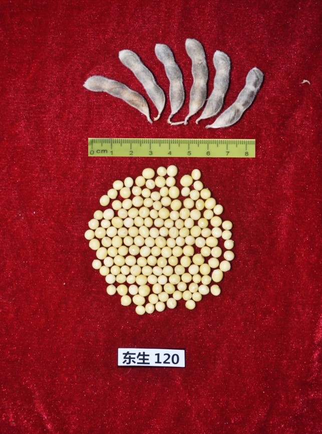 “东生120” (审定编号:吉审豆20210032)为高产、高油大豆新品种。该品种以吉大豆2号为父本,黑农48号为母本。2019-2020年区域试验平均公顷产量2975.8公斤,比对照品种吉育86增产7.1%;2020年生产试验平均公顷产量2947.3公斤,比对照吉育86增产3.8%。2019-2020年区域试验平均公顷产量2975.8公斤,比对照品种吉育86增产7.1%;2020年生产试验平均公顷产量2947.3公斤,比对照吉育86增产3.8%。亚有限结荚习性,平均株高88.9厘米,主茎型结荚,主茎节数16.4个,以三粒荚为主,荚熟时呈深褐色。圆叶、白花、灰毛,籽粒圆形,种皮黄色,有光泽,种脐黄色,平均百粒重18.5克。人工接种鉴定,高抗大豆花叶病毒1号株系,高抗大豆花叶病毒3号株系。两年平均籽粒粗蛋白质含量37.78%,粗脂肪含量22.10%。