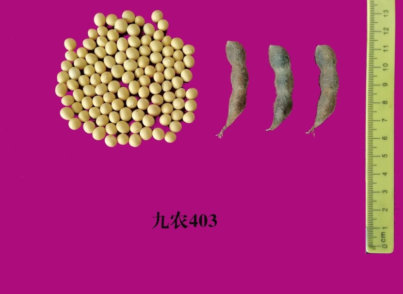 “九农403” (审定编号:吉审豆20210027)为高产大豆新品种。该品种以合丰51为父本,九农33为母本。2019年区域试验平均公顷产量3137.40公斤,比对照吉育86增产15.04%;2020年区域试验平均公顷产量3194.82公斤,比对照吉育86增产13.20%,二年区域试验平均公顷产量3166.11公斤,比对照吉育86增产14.12%;2020年生产试验平均公顷产量3171.79公斤,比对照吉育86增产12.18%。亚有限结荚习性,平均株高81.7厘米,主茎节数17.8个,有效分枝2.2个,三粒荚多,荚熟时呈褐色。尖叶、紫花、灰毛,籽粒圆形,种皮黄色,有光泽,种脐黄色,平均百粒重20.0克。人工接种鉴定,高抗大豆花叶病毒1号株系,高抗大豆花叶病毒3号株系。籽粒粗蛋白质含量38.81%,粗脂肪含量21.26%。