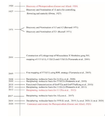 1920年研究者发现了大豆等植物可度量日照长度调节开花的现象即著名的植物光周期现象。随后,控制大豆开花遗传因子被相继发现,主要基因位点于上个世纪七十年代被定名。在大豆光周期发现百年华诞之际,我们回溯了E1、E2与E3等主要生育期基因的克隆历程(图1)。通过经典的图位克隆方法,于2009年成功地克隆了E3基因 (Watanabe et al., 2009); 2011年克隆了E2基因 (Watanabe et al., 2011),于2012年成功地克隆了E1基因(Xia et al., 2012)(图2)。特别是E1基因的成功克隆,为大豆光周期发现以来的重要突破,展示了大豆具有与其他植物在光周期反应上不同的特异性调控机制,为进一步精细解析大豆光周期反应的分子调控机理奠定了重要的基础。自成功克隆E1基因以来,研究者相继也成功地克隆了了与生物钟相关的PRR3a、LUX及J 等重要生育期调控因子,丰富了已明确的E1-FTs通路(图3)。为此,进一步鉴定调控生育期的新基因与进一步研究生育期基因间精细调控网络有助于人们最终破解大豆光周期反应的分子本质及明晰大豆适应不同纬度的精细分子机制。