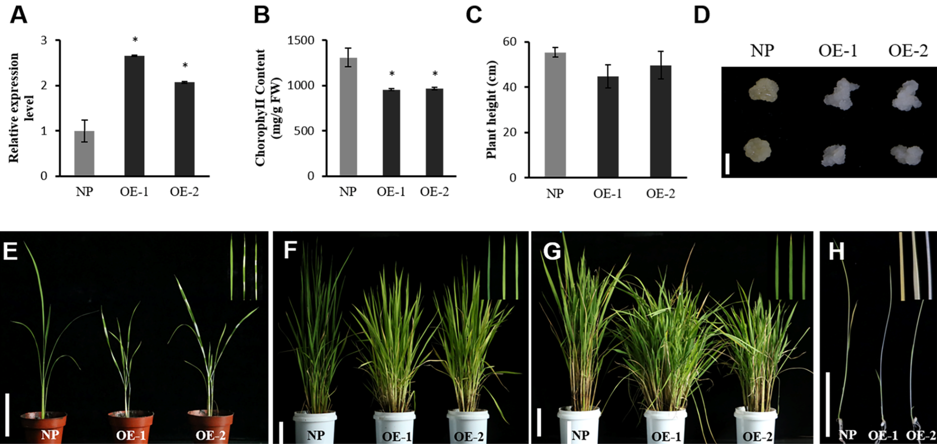 (A) 野生型植株与超量表达植株中OsOR基因的表达量分析。(B) 叶片中叶绿素含量检测。(C) 野生型植株与超量表达植株的株高分析。(D) 野生型与超量表达OsOR基因的愈伤组织表型分析。(E) 分蘖早期表型分析。 (F)分蘖晚期表型分析。(G) 成熟期表型分析。(H) 暗处理下表型分析。