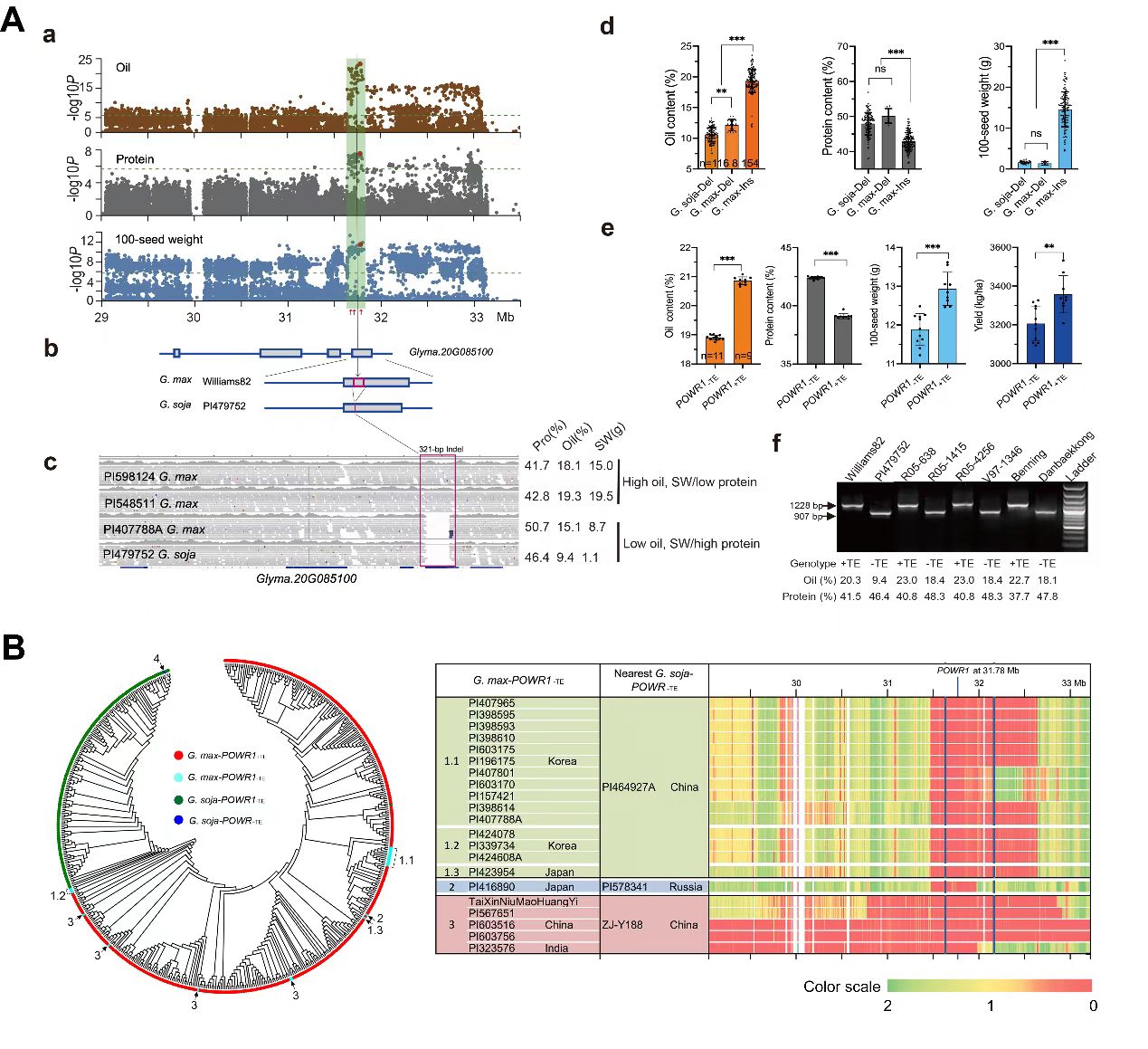 本研究利用经典连锁QTL分析结合基因组测序数据联合分析,鉴定到位于20号染色体的一个主效QTL cqPro-20。该QTL自1992年首次鉴定,在不同遗传背景中被鉴定到,但基因不清楚,发掘其控制基因一直是大豆蛋白研究的主要内容。研究发现一个编码CCT结构域的基因POWR1(Protein, Oil, Weight Regulator 1)控制cqPro-20,一个321-bp转座子在CCT结构域的插入/缺失是该位点引起蛋白和油脂变异的主因(图1A)。通过群体基因组学、近等基因系和大豆遗传转化研究证实POWR1调控蛋白质和油份含量,同时影响粒重和田间产量;突变和野生型分别控制高油和高蛋白表型,从遗传上解释了部分蛋-油负相关遗传基础。研究也表明POWR1是大豆驯化的重要基因之一,高油基因型受到强烈选择,推断对高油基因型的强烈选择主要是由于对大籽粒的优先选择而导致。高蛋白基因型在栽培大豆中含量很少且主要分布在亚洲,并且在POWR1位点有明显的基因导入痕迹(图1B),推测与本地高蛋白育种需求有关,符合亚洲自古都是大豆蛋白主要消费地的认识。这项研究为阐明大豆蛋白质和油份的分子调控机制以及高蛋白的精准分子育种带来了机遇。