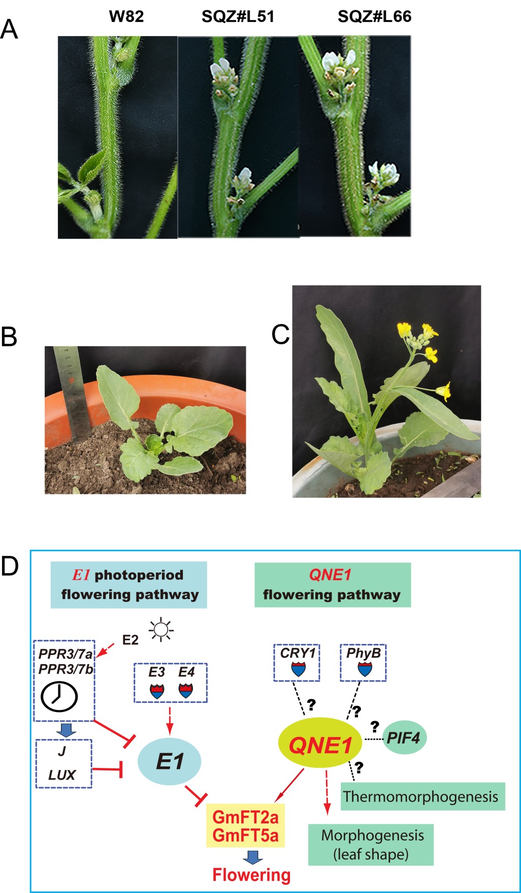 A:过表达Qne1大豆呈早花表型。W82:野生型Williams 82品种; SQZ#L51与SQZ#L66, 为过表达Qne1 植株。 B-C, 过表达Qne1油菜促进开花与引致叶形态变化。B:野生型油菜品种K407, C:过表达Qne1油菜植株。D:Qne1功能的模型图。 与日照时长密切相关的E1光周期开花通路相比,Qne1通路调控植物开花不受光周期所调控。同时Qne1 还调控植物叶片形态。