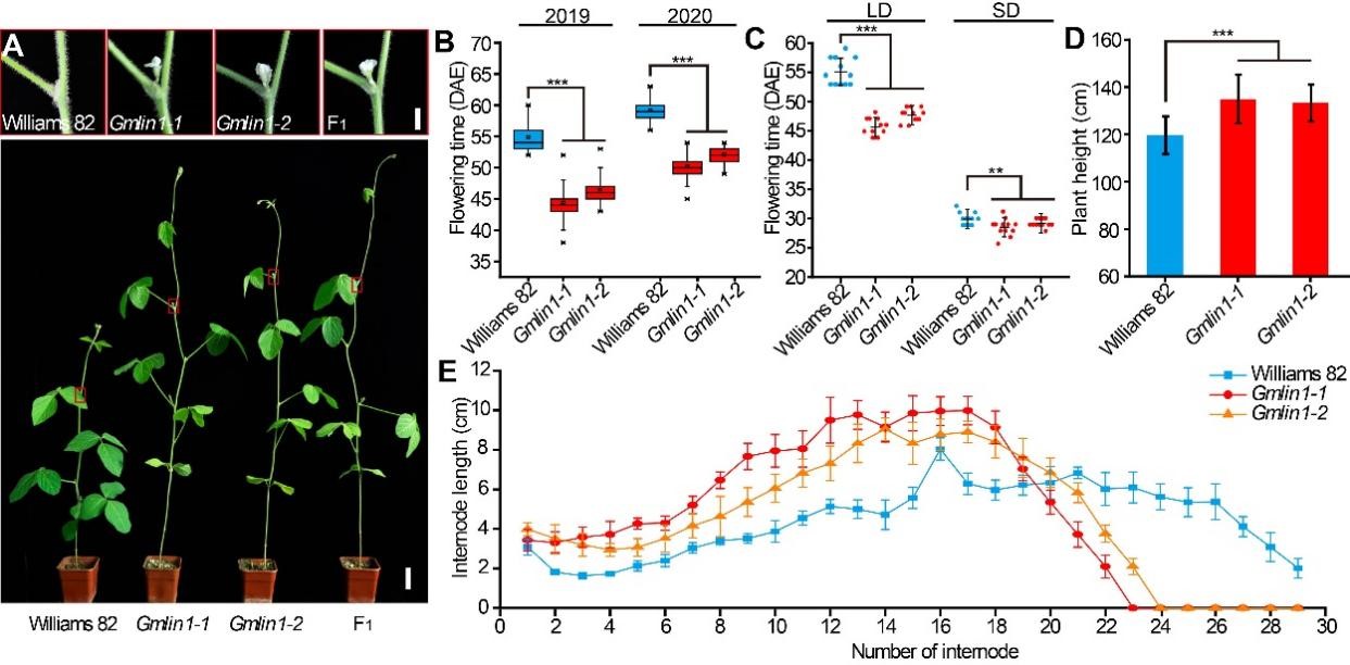 本研究通过正向遗传学方法,筛选得到大豆节间伸长及开花时间提前的突变体Gmlin1(Glycine max long internode1)。通过BSA测序方法定位候选基因GmHY2a,该基因编码大豆光敏色素生色团合成途径中的PΦB合成酶。本研究证明GmHY2a突变后影响了光敏色素蛋白在细胞核中的积累,从而影响植株在红光及远红光下的光形态建成。此外,Gmlin1突变体在正常光照下表现出组成型避荫反应,但在模拟避荫条件下比野生型表现得更耐荫,这为大豆密植和间作提供了理论参考;同时,Gmlin1突变体在长日照处理下开花时间显著提前,对光周期的敏感性降低,为大豆种植向高纬度地区扩张提供了育种材料和基因资源。该研究表明GmHY2a在大豆光敏色素生物合成以及大豆种植适应性中发挥重要作用,该研究工作增加了对光敏色素信号介导大豆生长发育的理解,并提出了光诱导的表型可塑性在改良潜在农艺性状中的重要性。