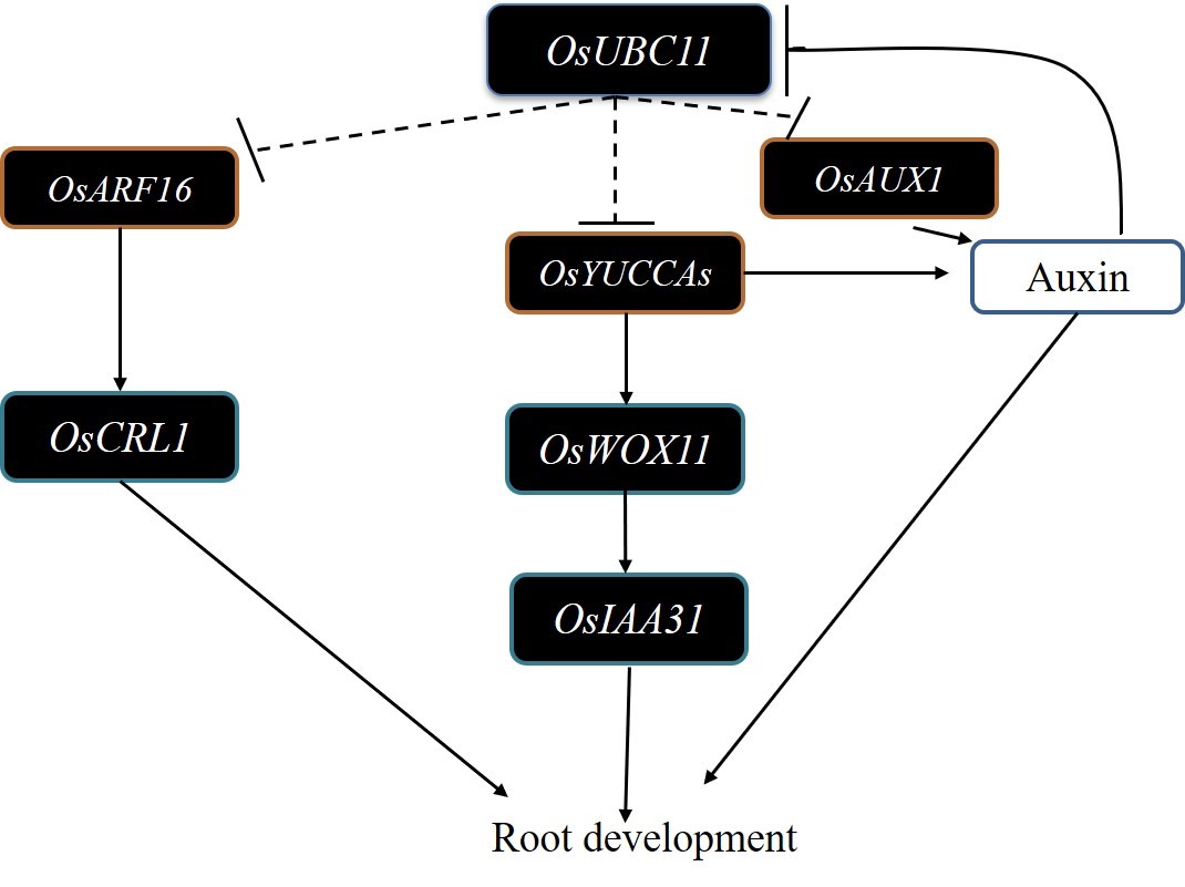 因此,寻找水稻根系发育调控基因并验证其功能一直是水稻育种工作者关注的重点之一。我所方军研究团队与兴安盟农牧业科学研究所徐兴健研究团队合作,在Rice(中科院一区TOP)上发表了题为“Ubiquitin-conjugating enzyme OsUBC11 affects the development of roots via auxin pathway”研究论文,研究人员鉴定出一个泛素结合酶基因OsUBC11调控了水稻主根及侧根的伸长,阐释了OsUBC11参与生长素途径来调控根的发育,为水稻根系发育研究及泛素结合酶分子调控机制提供新的思路(图2)。这对水稻根系发育调控网络提供重要补充,也为泛素结合酶家族基因的具体分子调控机制提供了新见解。