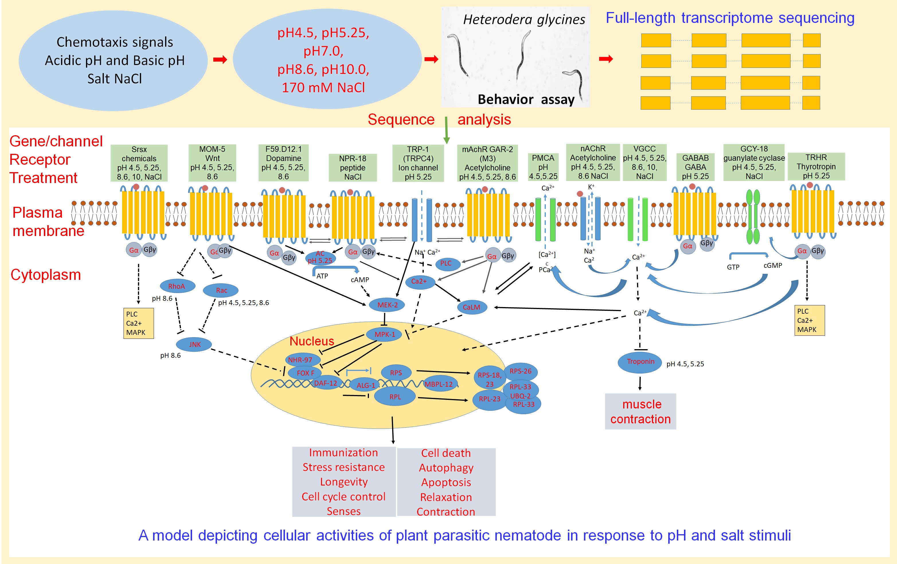 WormLab系统可实时追踪定量分析线虫行为,精准捕捉微小动物行为变化。该研究通过大豆孢囊线虫二龄幼虫对极端pH和适宜的趋化酸性和碱性pH、NaCl盐溶液胁迫下的行为学分析,表明线虫对不同非生物环境的行为学响应存在差异(图1)。进一步对经pH和NaCl溶液处理后的18个线虫样本进行三代全长转录组测序分析,以期从转录或转录后修饰水平解析线虫响应外界信号的调控机理,结果鉴定得到3,972个新基因和29,529个新转录本。转录本结构分析表明:可变剪接(AS)、可变多聚腺苷酸化(APA)、融合转录本等结构与对照相比发生了显著的变化,说明这些转录后修饰参与了线虫行为的调控。通过对差异表达基因GO(基因本体论)和KEGG(京都基因与基因组百科全书)富集分析,结果表明跨膜受体、离子通道和钙离子转运蛋白相关的信号通路被激活,核糖体和氧化磷酸化代谢途径被抑制(图2)。被激活的跨膜受体中至少有6种是G蛋白偶联受体GPCR,包括化学受体SRSX、Wnt受体MOM-5、多巴胺受体F59.D12.1、肽类受体NPR-18、毒蕈碱型乙酰胆碱受体mAChR和促甲状腺素释放激素受体TRHR,其他受体包括烟碱型乙酰胆碱受体nAChR、GABAB(γ-氨基丁酸受体β亚单元)和鸟苷酸环化酶受体GCY-18能够调控离子通道。线虫受体激活与生长发育受到抑制说明线虫在最佳趋化状态下或者极端环境下通过调整不同的代谢途径来维持自身能量的平衡,保持细胞稳态,维持生存。在酸碱盐条件下线虫的反应和存活机制也证实了大豆孢囊线虫能在酸碱盐土壤中发生的原因。结合差异表达基因和蛋白与蛋白互作分析构建了大豆孢囊线虫响应pH和盐离子刺激的细胞网络调控模型(图2)。本研究结果不仅丰富了线虫对化学信号反应机制的知识,而且所鉴定的不同跨膜受体及其离子通道是挖掘新型杀线剂的重要靶标。由于寄生线虫的保守性,由此推测大豆孢囊线虫可以作为一个模式寄生线虫研究线虫化感信号识别和反应机制,这些鉴定的受体也是开发药物防治人畜寄生线虫的潜在靶标,研究结果具有重要的科学意义和潜在的应用价值。