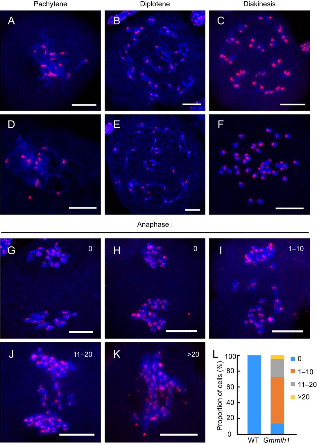 图1. 荧光原位杂交分析大豆Gmmlh1突变体中单价体和后期Ⅰ滞后染色体