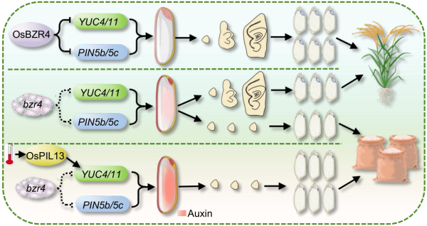 该研究首次发现,OsBZR4是调控无胚水稻的关键基因,在不同栽培品种中突变该基因均可产生60%-100%的无胚种子。OsBZR4特异表达于盾片-胚乳界面。进一步发现OsBZR4抑制YUC4和PIN5b的表达,通过调控早期发育种子中生长素含量和分布来发挥作用。外源施加生长素或过量表达YUC4均能提高水稻无胚率,而施用生长素运输抑制剂NPA则降低无胚率。此外,高温环境会显著增加bzr4突变株系的无胚率,发现高温能诱导OsPIL13基因表达,OsPIL13促进YUC4的转录,进一步增加生长素含量,从而解析高温增加无胚率的机制。有意义的是,将bzr4等位突变导入优良水稻品种中嘉10和中嘉11,在不影响水稻产量前提下,可提高精米产量和耐储性。