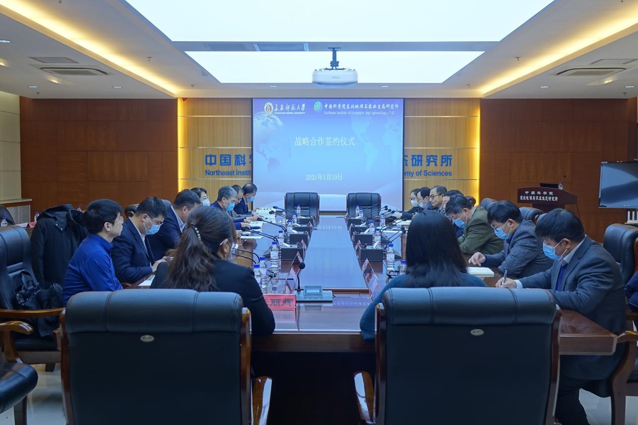 2021年1月19日,东北地理所与长春师范大学战略合作协议签字仪式在东北地理所举行。吉林省教育厅科研产业处处长曾繁明出席了本次签约仪式。长春师范大学校长刘春明、副校长张德利、研究生院院长许适琳、生命科学学院院长韩德复、地理科学学院院长费龙等一行十五人参加了签字仪式。东北地理所所长姜明、党委书记苏阳、副所长王宗明、副所长武海涛、大豆重点实验室主任冯献忠、黑土重点实验室主任田春杰、湿地重点实验室副主任祝惠、海伦实验站副站长李禄军、人事教育处处长郭琳、科研计划处副处长崔明星、研究生部主任王玉荣等参加了签字仪式。签字仪式由王宗明主持。