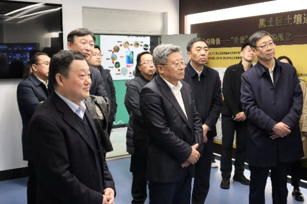 在东北亚种质资源研究中心二楼,调研组现场参观了研究所标本馆及“黑土粮仓”科技会战指挥系统,科研团队通过动态演示及现场监测数据,展示了“黑土粮仓”科技会战组织构架及会战进展,黑土地保护与利用区域适宜性技术模式及示范推广成效。孙东生强调,需持续深化科技赋能,不断完善覆盖全链条的黑土地生态保护技术体系。