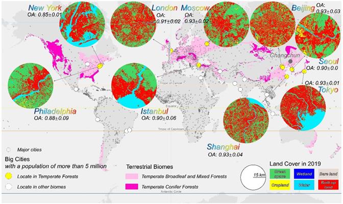 图2. 2019年15m分辨率世界主要城市景观覆被