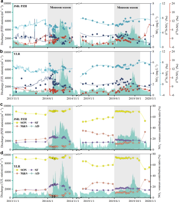 近日,项目研究团队选取两条高原河流——多年冻土占比较高的金沙江流域(JSR)与多年冻土占比较少的雅砻江流域(YLR),基于长时间尺度的硝酸盐浓度记录数据及2013–2019年间的多次高频采样测定数据(NO3-浓度与双同位素 δ15N-NO3- / δ18O-NO3-;图1),结合通量重建(LOADEST)、浓度–流量(C–Q)分析与“空代时”方法,系统解析了高海拔河流在气候变暖背景下NO3-输出的长期变化规律与控制机制。