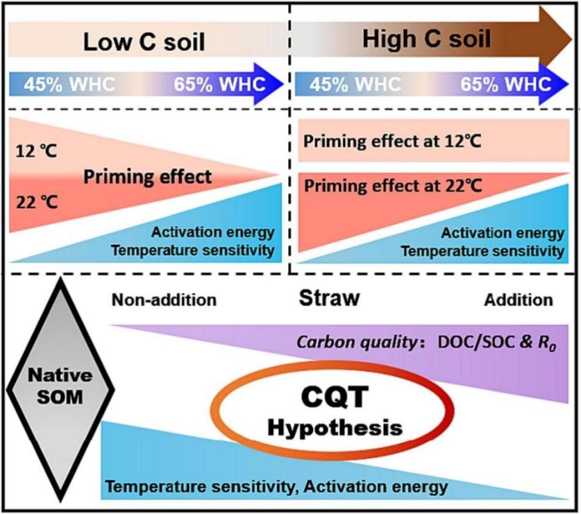 土壤有机质(SOM)在农田土壤肥力维持、碳封存和缓解气候变化起着至关重要的作用,将作物残留物还田被认为是维持和提升SOM的重要措施之一,然而,残留物还田可能加速SOM的矿化,即为激发效应(PE),温度敏感性(Q10)作为表征SOM矿化特性的重要参数,很大程度上决定着陆地生态系统碳循环与气候变暖之间反馈关系的方向与强度。影响SOM矿化过程的因素既包括生物因素,如土壤微生物和植物等,也包括非生物因素,如土壤水分和温度等。尽管大量研究对SOM矿化过程及其驱动机制开展了深入探讨,但是在外源有机物输入条件下,多因素耦合影响下如何影响SOM矿化过程尚不明确。