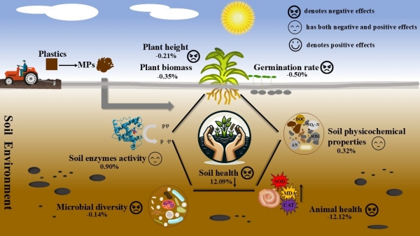 研究发现,微塑料对黑土产生了显著的负面影响,综合导致黑土健康下降12.09%。具体而言,微塑料显著增加了土壤有机质、溶解性有机碳和速效氮的含量,但降低了硝态氮和铵态氮的含量。在土壤酶活性方面,微塑料使脲酶活性提高11.24%,但磷酸酶活性降低6.62%。微塑料严重破坏了土壤微生物多样性,细菌和真菌的Chao1指数分别下降3.52%和9.57%。此外,微塑料对土壤动物造成氧化应激损伤,蚯蚓体内丙二醛、过氧化氢酶和超氧化物歧化酶分别显著升高208.89%、22.43%和55.38%。植物生长也受到明显抑制,种子萌发率下降22.81%,植物总生物量减少7.42%,根系生物量降低12.82%。熵权法和层次分析法分析权重结果显示,土壤理化性质(33.70%)、动物健康(21.48%)和微生物多样性(19.98%)是影响黑土健康的最重要因素。该研究首次系统量化了微塑料对黑土健康的综合影响,研究结果对于制定黑土保护政策、优化农业管理实践以及应对全球塑料污染挑战具有重要科学价值和实践指导意义。