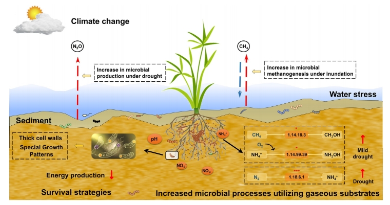 由气候变化和人类活动引发的干旱事件日益频繁,对湿地生态保护提出了严峻挑战,加剧了湿地生态系统中植物与微生物群落的养分限制。然而,干旱胁迫对沼泽湿地生态健康的不利影响,尤其是其对湿地物质循环的微生物驱动机制,尚未得到系统阐明。为此,研究团队在中国东北典型湿地开展了为期6年的控制性水文实验,通过长期自动调控四种水位梯度——L1(严重干旱)、L2(轻度干旱)、L3(对照水平)和L4(淹水状态),解析湿地生态功能的变化规律。结果表明,严重干旱与淹水条件均会降低土壤氮有效性(以NH4+为主,降幅达34.4%–43.6%)。微生物群落通过代谢调控策略适应水分与养分短缺,尤其表现为抑制能量产生途径,包括糖酵解/糖异生和三羧酸循环。在物质循环方面,干旱显著促进了微生物固氮作用(增幅达31.7%–419.4%),为缓解湿地氮限制提供了重要的潜在条件。在生态功能上,淹水条件促进湿地微生物产甲烷过程。研究还发现影响碳氮代谢途径的环境因子存在季节性分异规律。该研究成果为未来湿地生态保护,尤其是极端气候变化下缓解生态系统养分耗竭提供了重要理论支撑。