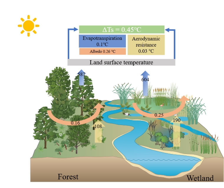 湿地作为重要的基于自然的气候解决方案,其价值主要源于厌氧土壤环境下的碳储存能力。然而,湿地通过反照率和蒸散等过程对地表温度产生的生物物理效应,研究仍相对不足。与森林相比,湿地通常具有更高的土壤蒸发量和地表反照率,但植物蒸腾作用较弱,导致其净生物物理影响存在较大不确定性。为此,本研究通过结合物理推导变量与机器学习方法,系统量化了湿地与森林之间的地表温度差异,并深入解析其驱动机制。研究结果显示,全球76%的湿地表现出年均冷却效应,平均降温幅度为0.45°C ± 0.08°C,而34%的湿地则呈现净增暖趋势。冷却效应存在明显的纬度分异:寒带湿地冷却效应最强,中纬度地区则较弱甚至出现增温。此外,湿地冷却效应还具有显著的昼夜不对称性,夜间冷却强度明显高于白天。从季节变化来看,春季湿地的冷却效应最为突出,夏季则相对较弱。在驱动机制方面,地表反照率是主导全球48%湿地温度调节的关键因子,尤其在北方中纬度地区作用更为显著。通过整合物理推导变量与机器学习方法(如随机森林模型),本研究揭示了不同纬度和季节尺度下湿地与森林的温度差异模式及其形成机制,深化了对陆地生态系统—气候反馈过程的理解,为湿地保护与气候适应性管理提供了科学依据。