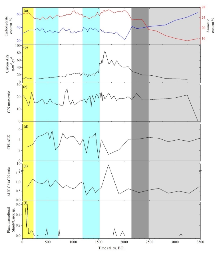 研究发现,泥炭地逐渐从湖相腐泥经过富营养矿养并演变为贫营养矿养阶段。随着泥炭厚度增加,泥炭土壤中的芳香族碳含量显著上升,从17.1±1.7%增至25.1±1.1%。在2200 cal. yr B.P.之前,由于泥炭地形成初期的泥炭厚度较薄,泥炭累积过程减少了矿物来源,而化学稳定性逐渐升高并实现维持碳库的稳定。随着泥炭厚度持续增加,养分与矿物来源在2200 cal. yr B.P.之后趋于稳定,当地植被与环境条件成为改变碳库化学稳定性的主要因素。较高的草本植物凋落物量、减弱的分解程度,以及冷湿气候条件降低了泥炭地碳库的稳定性。而随着人类活动在300 cal. yr B.P.以来持续增强并导致泥炭地碳周转速度增加也成为提高泥炭地碳库化学稳定性的重要因素。