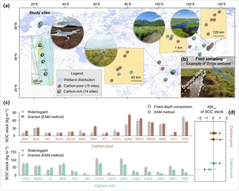 湿地土壤碳库受到排水的严重威胁,但其储量变化存在很大的不确定性,制约了我们对湿地碳动态的准确评估。以往研究多关注高纬度富碳湿地(泥炭地),而对中低纬度广泛分布的贫碳湿地关注不足。此外,许多研究通过固定深度采样比较淹水和排水湿地土壤有机碳(SOC)储量,忽略了排水可能引起的土壤容重变化,可能造成系统性偏差。针对以上问题,本研究开展了跨洲湿地配对调查,在中国与芬兰选取29对自然淹水与人工排水湿地,采用等效灰分质量法对剖面进行灰分质量校准,比较了贫碳与富碳湿地SOC储量对排水的响应差异,并解析了其调控因素。